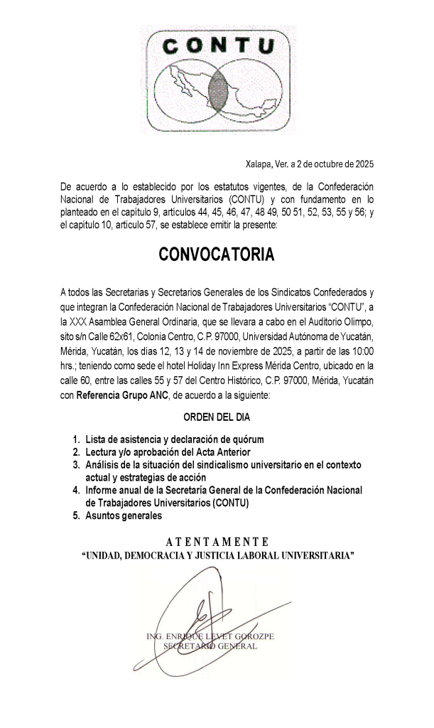 A todos las **Secretarias y Secretarios Generales** de los Sindicatos Confederados y que integran la Confederación Nacional de Trabajadores Universitarios “CONTU”, a la **XXX Asamblea General Ordinaria**.